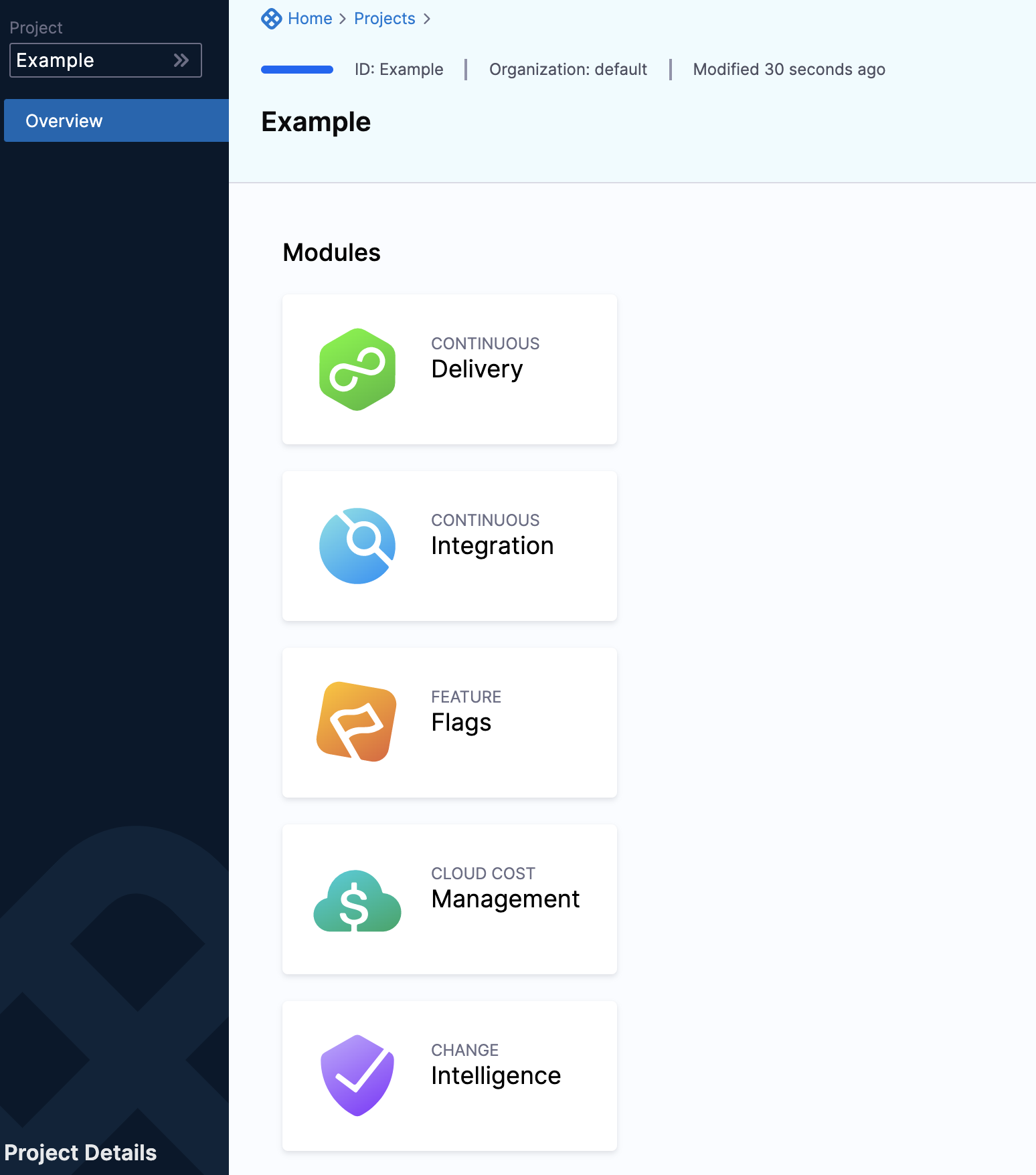 Harness Organizations (Orgs) allow you to group projects that share the same goal. For example, all projects for a business unit or division.